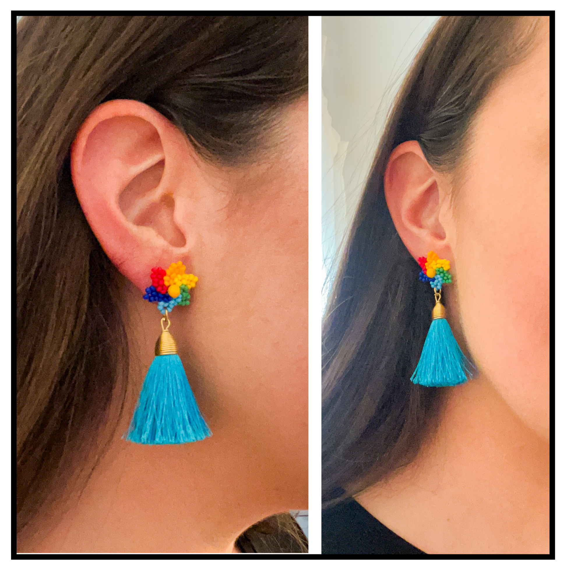 These stud earrings have a beautiful six-pointed beaded star with a woven gold drop and a colorful tassel!